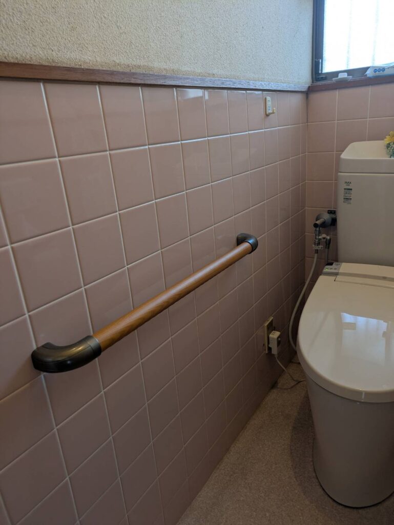 便所にも手すり設置いたしました。こちらは便座からの立ち上がり用となります。こちらにあると安心ですね。