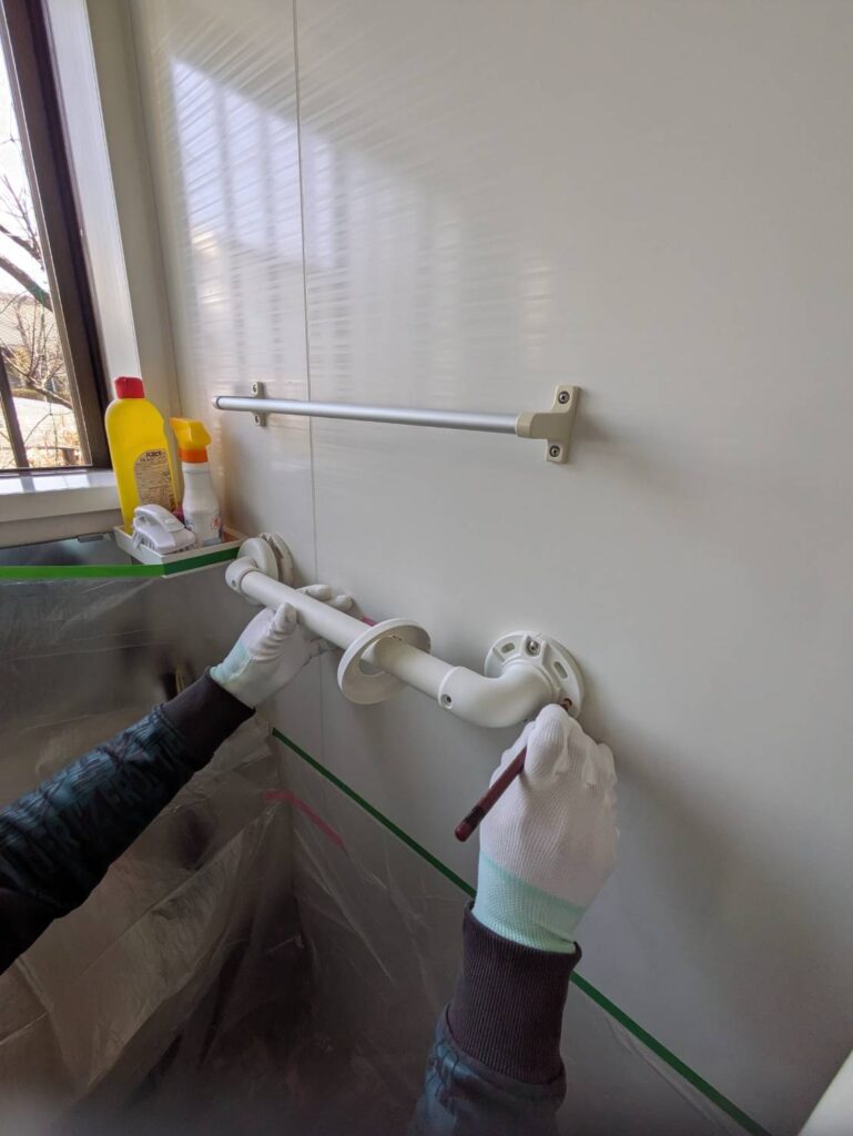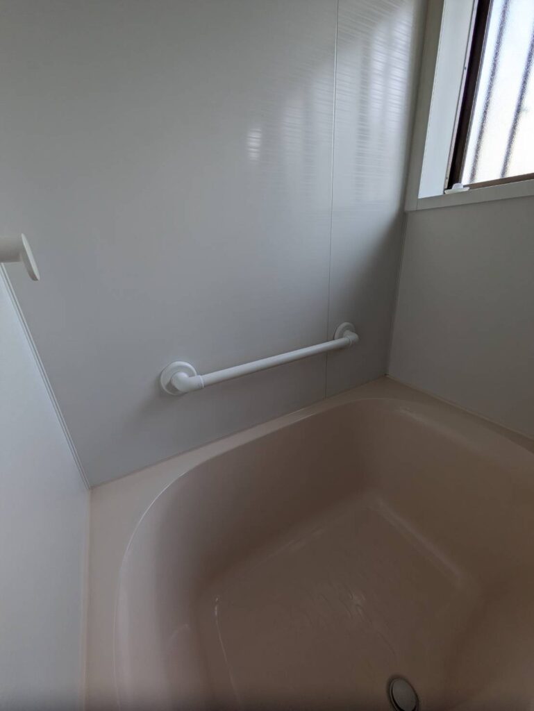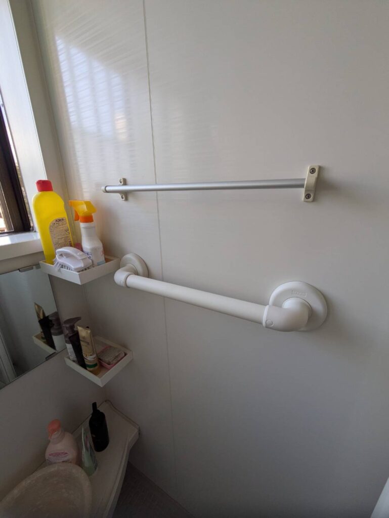 浴室内にも手すり設置いたしました。材質は水まわりのため浴室用手すりです。専用のものがあるので安心ですね。L型のものなど長さも選定でき種類も豊富です。