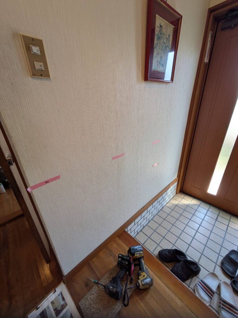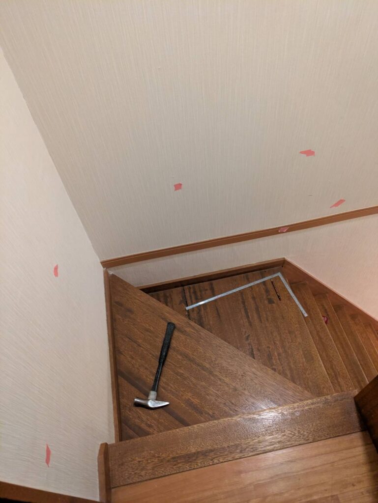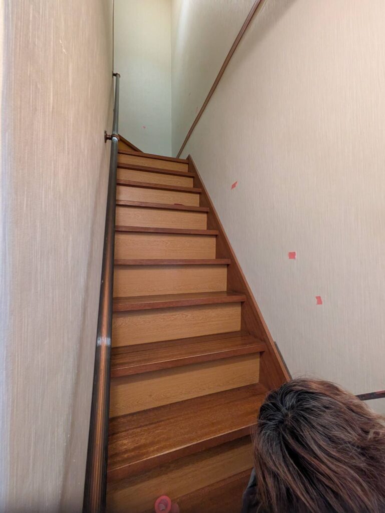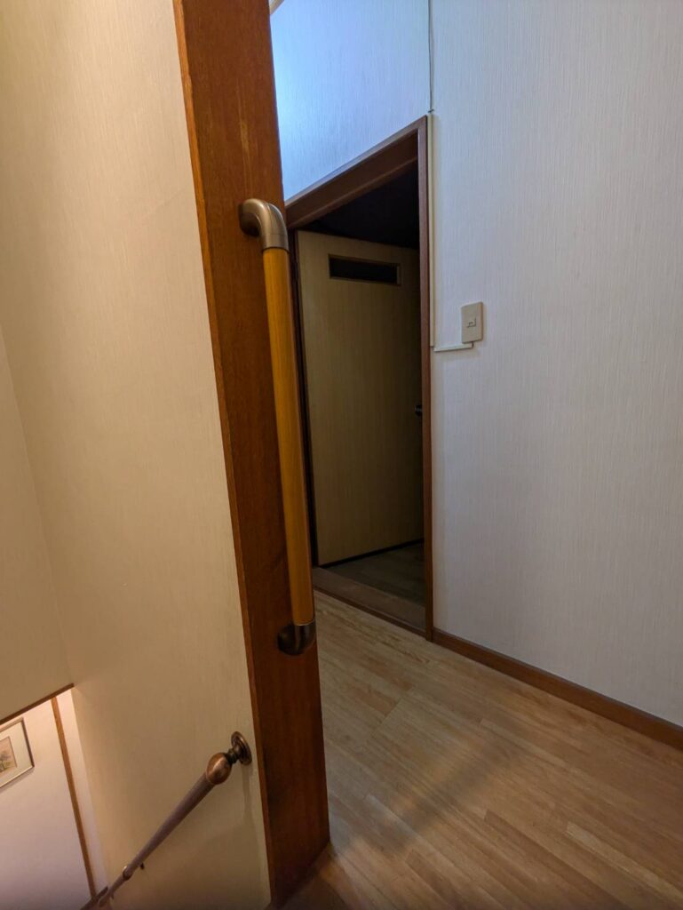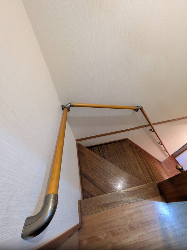 2階への階段まわりに手すりを設置いたしました。施工前及び施工後です。